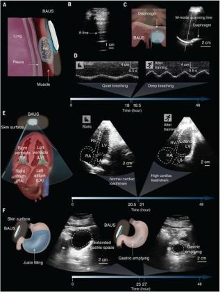 结果显示了各种器官的清晰图像,包括血管、肌肉、心脏、消化道、膈肌和肺部。在连续监测的48小时内,参与者还进行了各种身体活动,比如慢跑和骑自行车,而超声成像并没有出现任何问题。