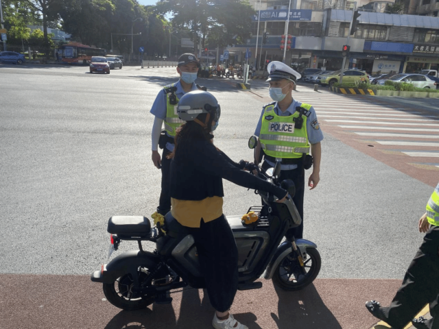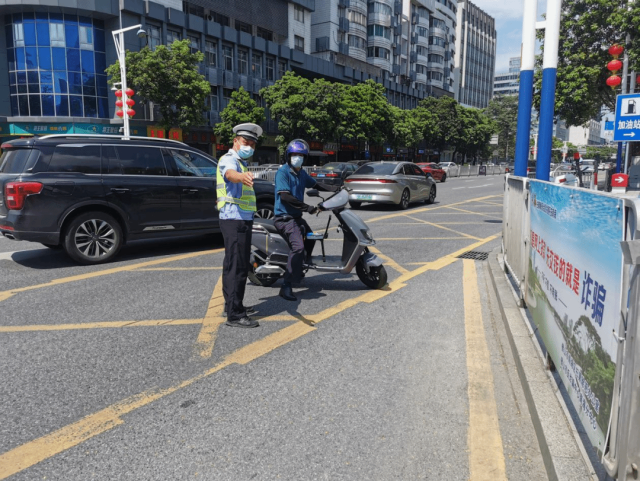 在高峰时段,交警部门对摩托车、电动自行车无牌无证、不戴头盔、闯红灯、逆行、一车多人等违法行为的劝阻,落实“摩电”车辆交通违法现场纠正,对不听劝阻和教育的依法进行处罚。同时,对违反交通法律法规的驾驶员进行登记违法信息,观看警示教育视频。