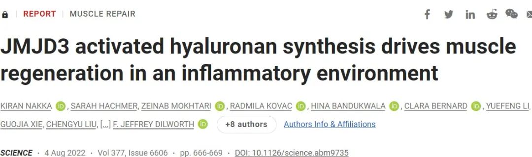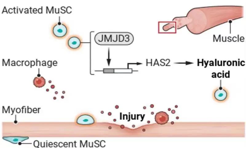 8月4日,发表在《Science》杂志上的一项新研究“JMJD3 activated hyaluronan synthesis drives muscle regeneration in an inflammatory environment”揭示了一种控制肌肉修复的独特细胞通讯形式。肌肉干细胞(MuSC)通过激活细胞外基质蛋白透明质酸 (HA) 的产生,克服来自损伤生态位的抑制性炎症信号、退出静止状态和启动肌肉修复。