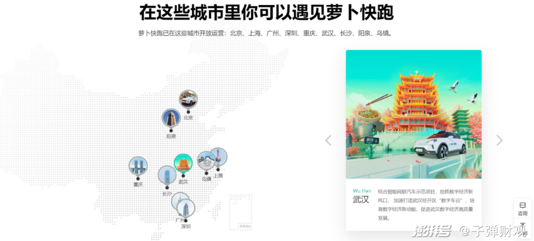 萝卜快跑官网显示,除武汉之外,同为第一批试点的城市还有北京、上海、广州、深圳、重庆、长沙、阳泉和乌镇。截止2022年7月,萝卜快跑累计订单量突破100万。并计划在2023年底将自动驾驶出行服务开放至30个城市,部署至少3000辆自动驾驶汽车,为3000万用户提供出行服务。