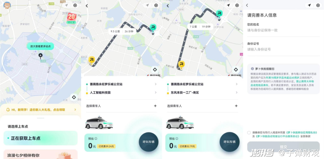 首先,出行的起点和终点都是固定的,乘车人只能按照自己行程就近选择,且出行覆盖的区域只能在试运营的范围内。其次,行程计价明显高于一般网约车,16元的起步价远高出武汉市出租车起步价的60%,好在目前均是免单体验。最后,需要提供姓名和身份证号码才可以下单,乘车人年龄必须在18岁到60岁之间,且需实名认证。
