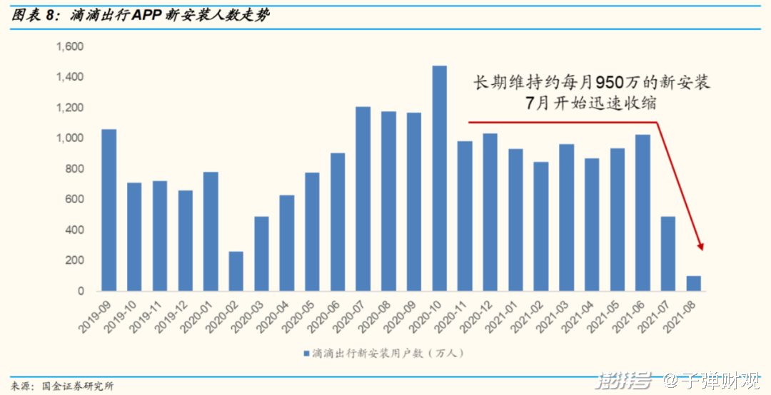 「子弹财观」从国金证券获悉,在2021年7月前,滴滴App的每月新安装用户约950万,自下架开始滴滴App的新安装数量出现了断崖式下降,8月滴滴App的月安装用户已经下降至100万左右。