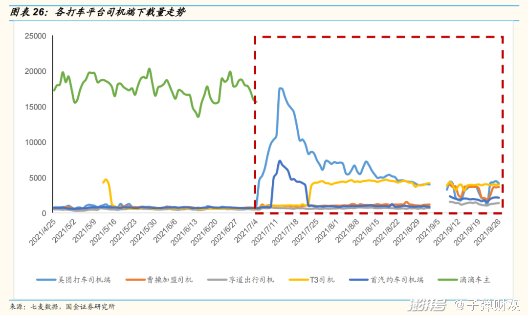 国金证券的另一组数据显示,在2021年7月4日滴滴App被下架之前,滴滴平台司机端的下载量连续十周稳在1.5万到2万次之间,其他平台的下载量则均未超过1000次。而在7月4日之后,滴滴司机端的下载量被“一夜归零”,此时的美团打车的司机端下载量迅速拉升至7月中旬的1.7万次。