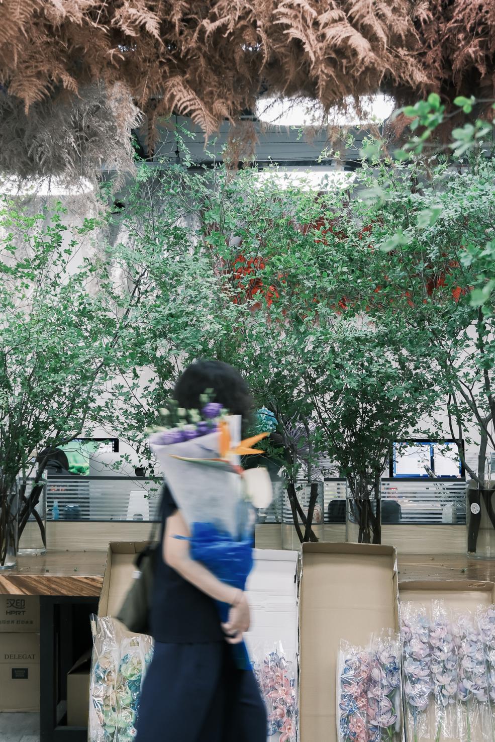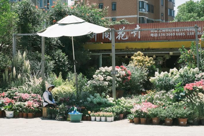 普陀这块有种说不清道不明的混迹感,市井味儿重,每间铺子的老板都拥有一台自己的老板椅、办公桌,四周被自家鲜花包围得密密实实,画面实在很有意思。