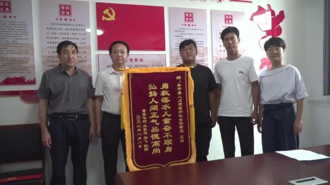 8月8日,家住保定市竞秀区富昌屯村的朱雪刚夫妇来到我县人力资源和社会保障局,将一面写着“勇救落水儿童奋不顾身 ”的锦旗送到该单位职工王杰的手中,深深表达了对孩子救命恩人的感激之情。