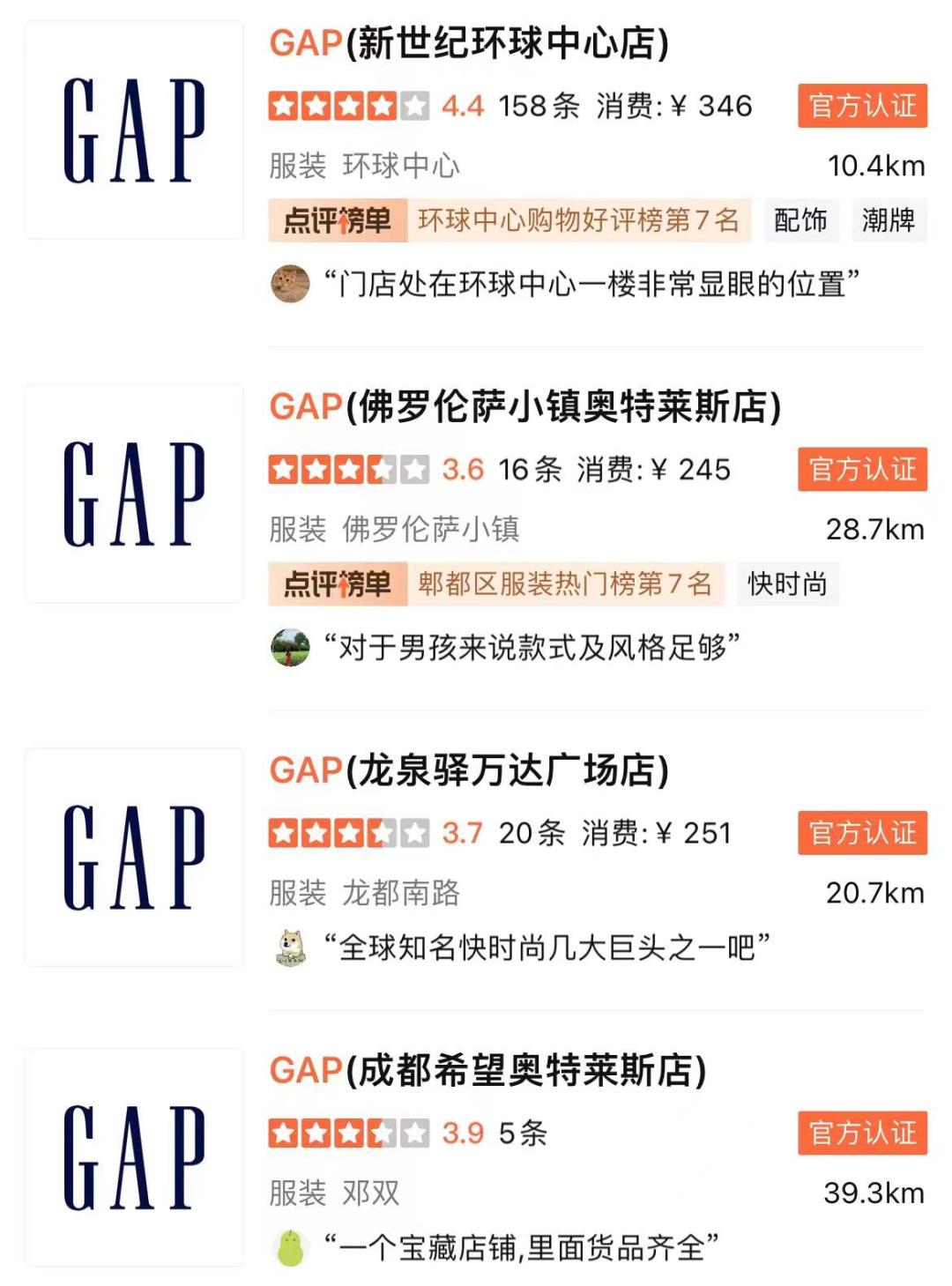 商妹儿通过大众点评搜索了下,目前GAP在成都有8家店。