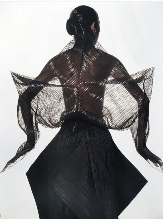 1993年,三宅一生推出全面使用这种技术的副线品牌PLEATS PLEASE ISSEY MITAKE,服装就如雕塑一样,在人身上非常贴合优雅。
