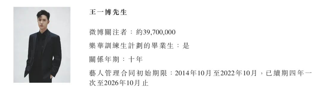 另外,供应商B的合约与续约情况与王一博有相同之处。招股书披露,供应商B,为乐华训练生计划的毕业生,该艺人合同有效期至2026年,而乐华披露的王一博合同期至2026年10月止。