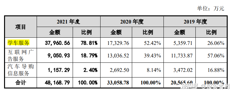 在2019年之后,学车服务异军突起,2020年贡献了52.42%的营收,2021年这一比例进一步扩大,高达78.81%。收入从2019年的5000余万元升至3.8亿元。