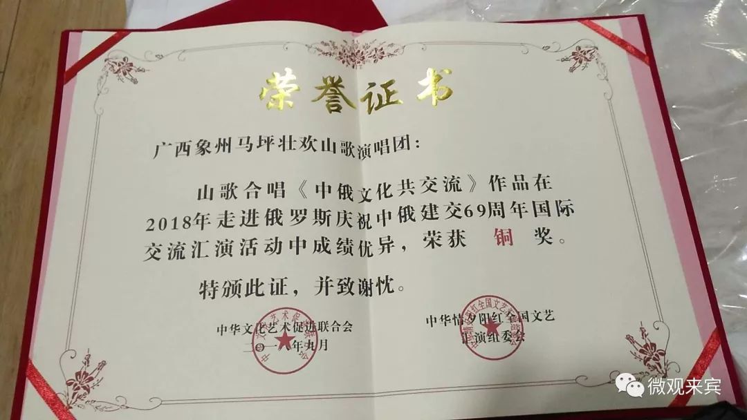 象州马坪壮欢山歌团在俄罗斯演出获得的荣誉。