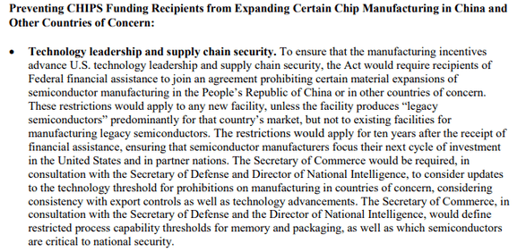《芯片法案》原文中有12处提到China,其真实目的昭然若揭。为了让芯片制造企业回流,美国政府不惜在《芯片法案》中赤裸裸规定,拿到政府补贴的美国半导体企业必须在未来相当长的时间内放弃对华扩产,期限至少是10年。