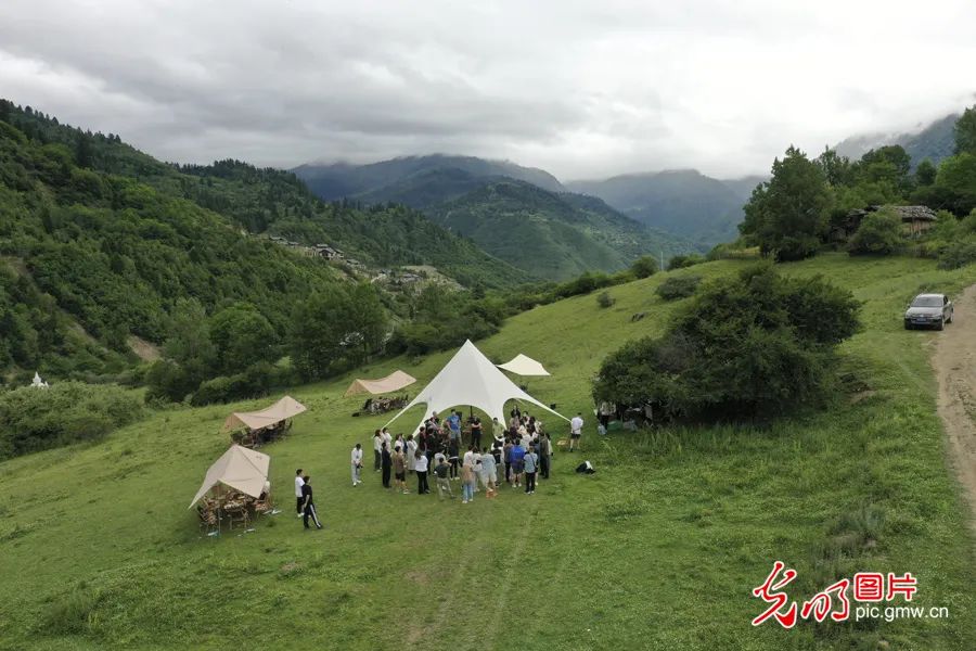 2022年7月16日,四川省阿坝藏族羌族自治州九寨沟县中查村,绿树环绕的山坡吸引人们前来休闲。(光明网记者 李毅成摄/光明图片)