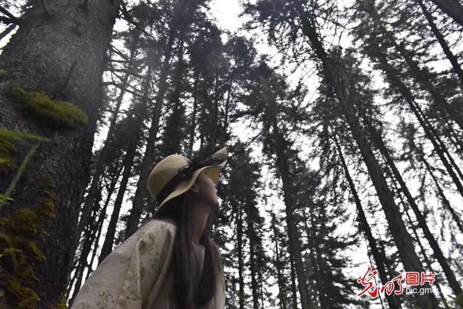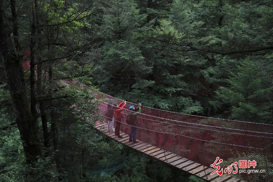 2022年7月17日,四川省阿坝藏族羌族自治州九寨沟县“格林七号乐园”,穿梭于云杉林中给人以静谧深邃的感觉。(光明网记者 李毅成摄/光明图片)