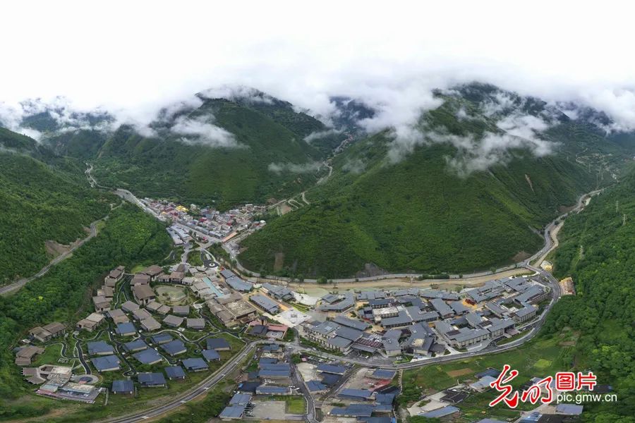 2022年7月17日,四川省阿坝藏族羌族自治州九寨沟县,航拍群山环绕云雾缭绕的鲁能美丽汇非遗街区。(光明网记者 李毅成摄/光明图片)