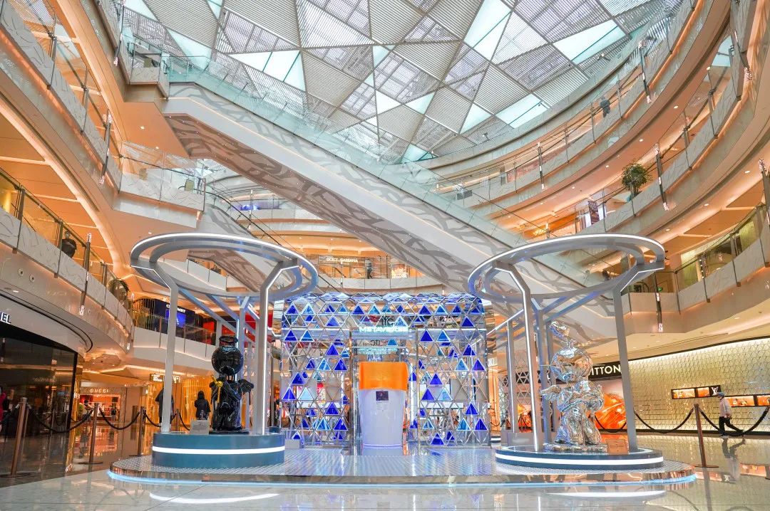 上海国金中心商场中庭最近有了一些新变化。商场携手著名潮流先锋艺术家欧阳儒打造“潮星球·元宇宙”先锋艺术展,跨越空间,将现实与虚拟世界融合,展现充满未来感的新次元,带来元宇宙这个时下最新兴的热门话题。