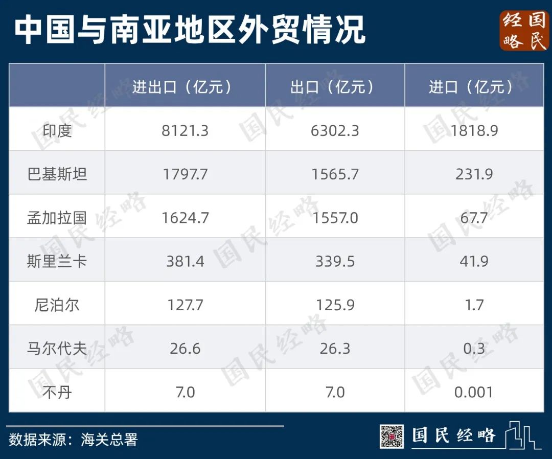据海关统计,2021年中国对尼泊尔外贸进出口总值仅为127.70亿,约为我国对南亚地区外贸总额的1%左右。其中出口125.98亿元,主要以新冠疫苗、鲜苹果、手机为主,进口1.71亿元,可以忽略不计。