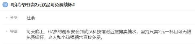 7月28日,话题#良心爷爷卖2元饮品可免费续杯#登上微博热搜,话题阅读次数高达2亿。