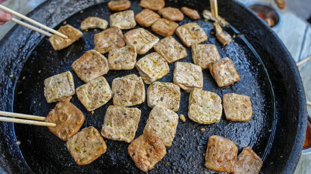 一个火炉,一张烤架,几人围炉坐下,“煽”着豆干,“摆”着龙门阵(“煽豆干”,方言,意指吃烤豆干;“摆龙门阵”,方言,意为聊天),豆干香味四溢,谈笑声不绝于耳,一晃,便是大半天的光景。而豆干,便是其间画龙点睛的那一笔……