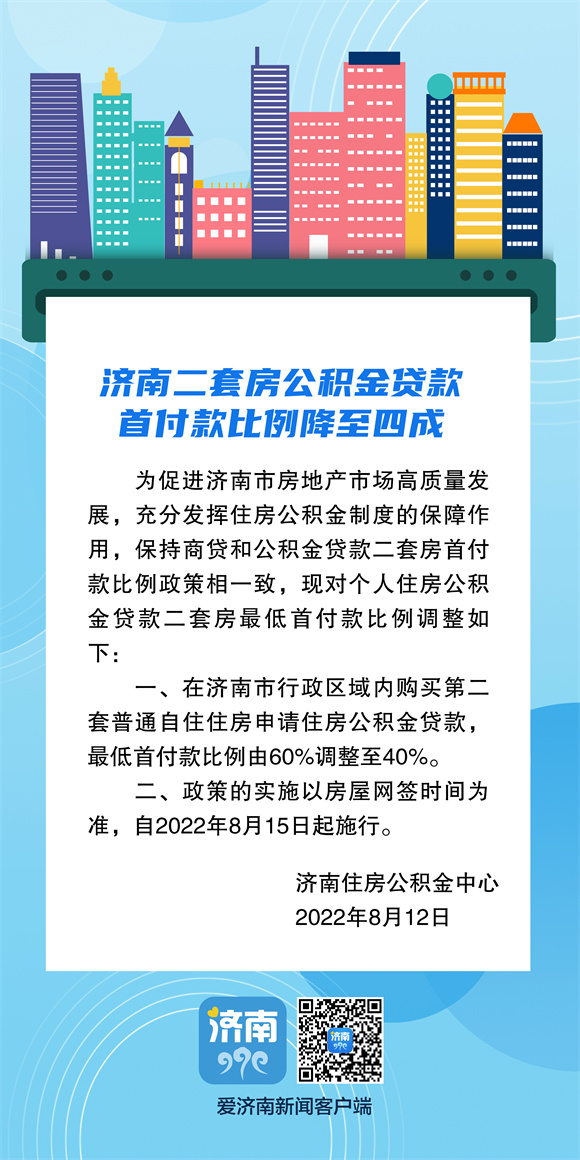 8月12日,记者从济南住房公积金中心了解到,为促进济南市房地产市场高质量发展,充分发挥住房公积金制度的保障作用,保持商贷和公积金贷款二套房首付款比例政策相一致,对个人住房公积金贷款二套房最低首付款比例作出调整,最低首付款比例由60%调整至40%,在济南市行政区域内自2022年8月15日起施行。