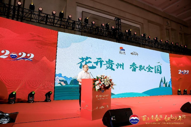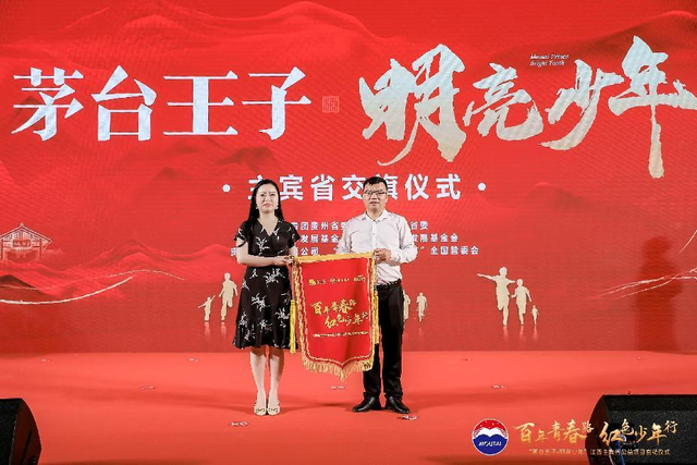 仪式现场,江西省青少年发展基金会毛鸿山同志从贵州省青少年发展基金会副秘书长洪叶手中接棒“茅台王子·明亮少年”公益项目主宾省旗帜,并就2022年“茅台王子·明亮少年”——江西希望工程“百年青春路·红色少年行”活动作介绍。