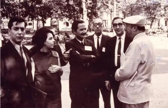 左起:巴尔加斯·略萨和他的妻子帕特里夏;卡洛斯·富恩特斯; 胡安·卡洛斯·奥内蒂;埃米尔·罗德里格斯·莫内加尔和巴勃罗·聂鲁达,1966年