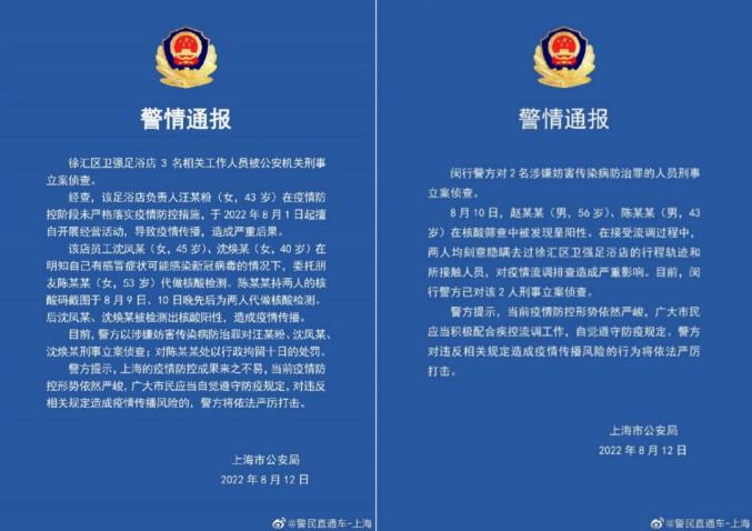 8月12日,上海市公安局发布消息称,徐汇区卫强足浴店3名相关工作人员、2名曾到店的顾客以涉嫌妨害传染病防治罪,被公安机关刑事立案侦查。同时,另1人为足浴店员工代做核酸检测,被处以行政拘留十日的处罚。