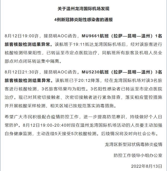 8月12日21:30许,接昆明AOC函告,MU5230航班(拉萨—昆明—温州)3名旅客核酸检测结果异常。该航班已于20:12降落,经在龙湾国际机场对该3名旅客进行核酸检测,3名旅客结果均为阳性。