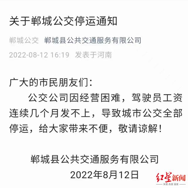 8月12日,网传河南周口市郸城县公共交通有限公司发布公告称:“因经营困难,驾驶员工资连续几个月发不上,导致城市公交全部停运,请大家谅解”。