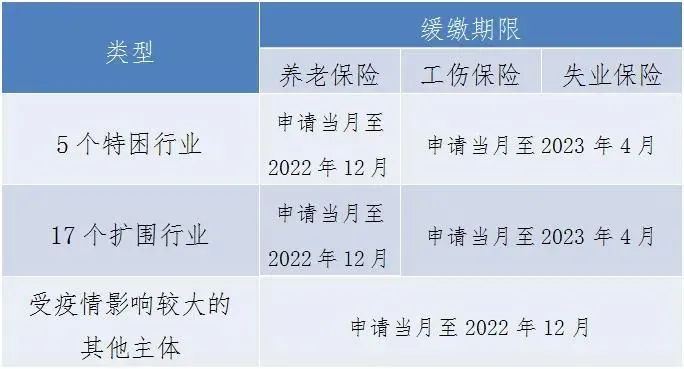 此次扩围的17个困难行业企业,申请缓缴应同时符合受疫情影响生产经营出现暂时困难、2022年度内连续三个月累计出现亏损和申请缓缴时为正常缴费状态三个条件。可申请缓缴的期限与5个特困行业相同。