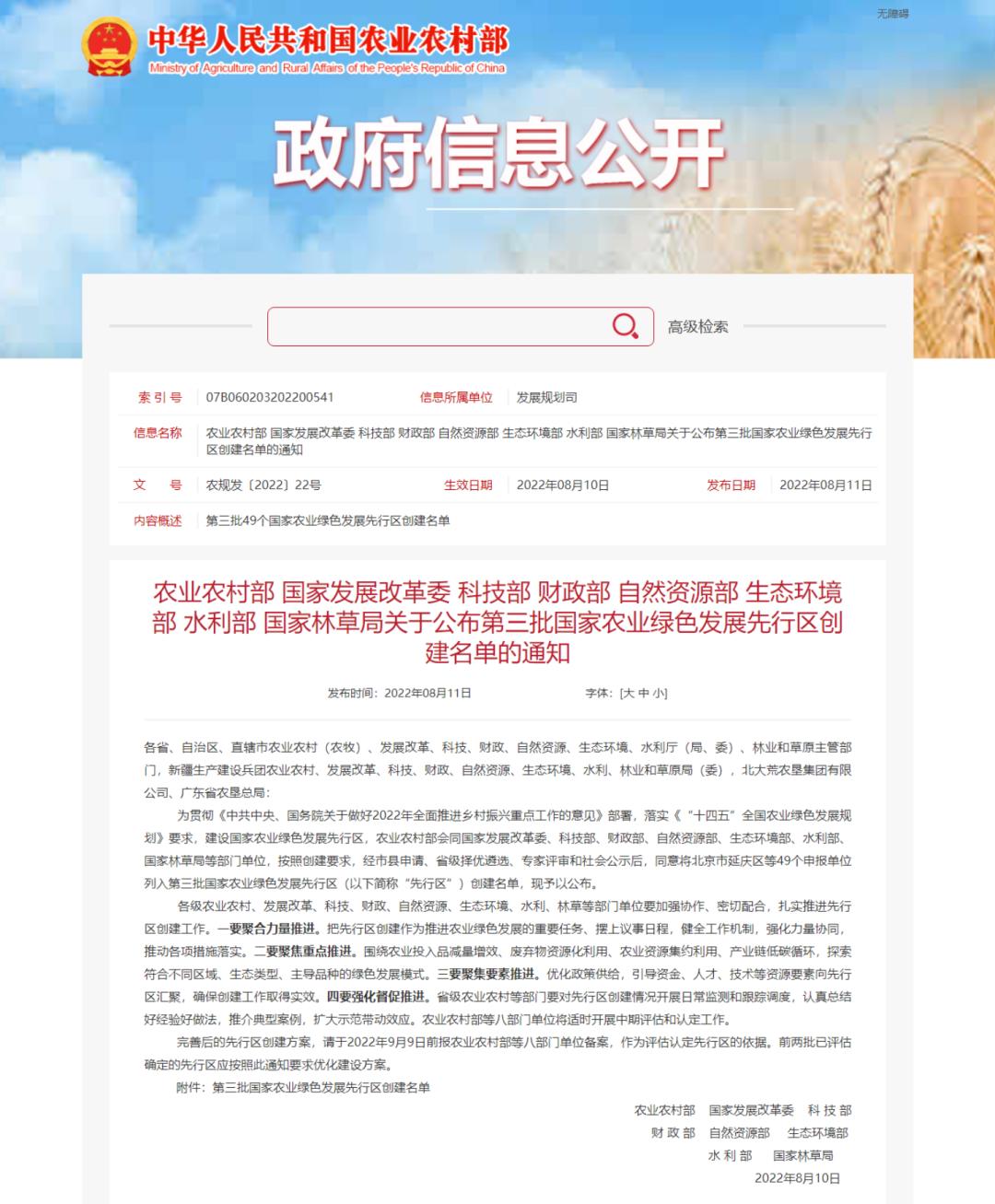 《关于公布第三批国家农业绿色发展先行区创建名单的通知》