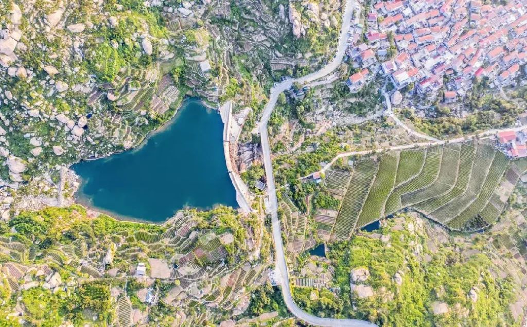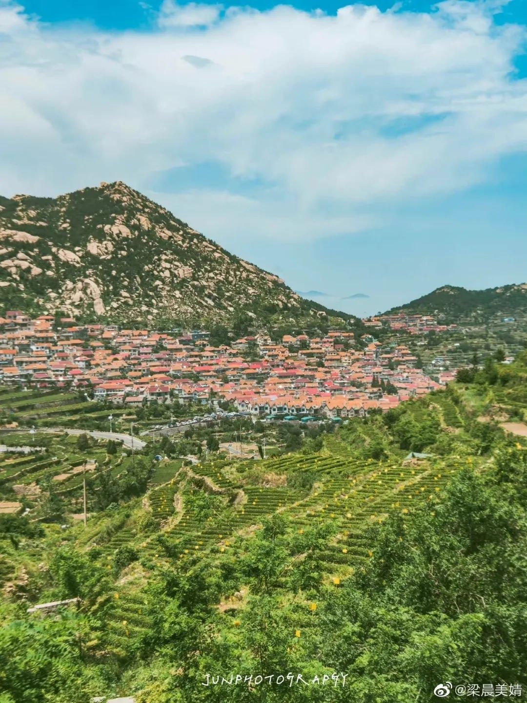 红瓦石墙,依山而建、错落有致的村居在蓝天碧海的映衬下显得分外夺目,村子两旁的山坡上是碧绿的茶园。