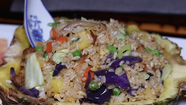 但对于夜宵来说,最抚慰人心的莫过于一碟“菠萝炒饭”。准备半只菠萝,把菠萝肉挖出,留壳备用,再加入喜欢的配料如虾仁、肉丁、鸡蛋等,出锅的炒饭粒粒分明、金黄诱人,再搭配同样色系的菠萝,一同盛入半只菠萝壳中,无论从风味还是视觉上都是一绝。