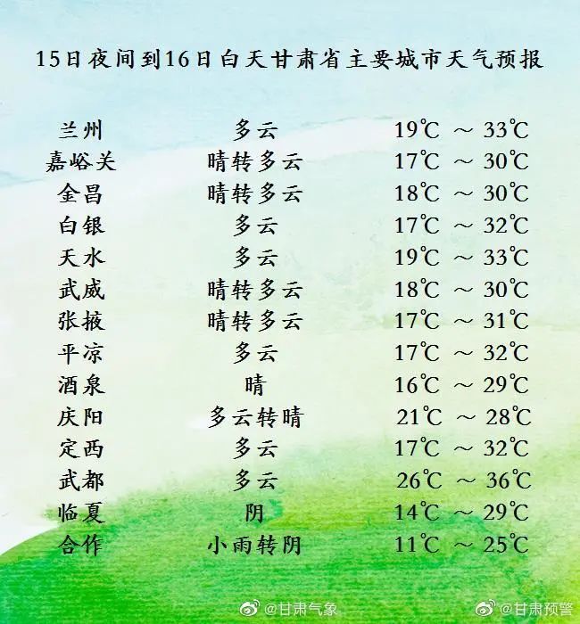8月15日夜间到8月16日白天,甘南、定西、陇南三州市多云,局部地方阴有阵雨或雷阵雨;省内其余地方晴或多云,祁连山区东部阴有阵雨或雷阵雨。