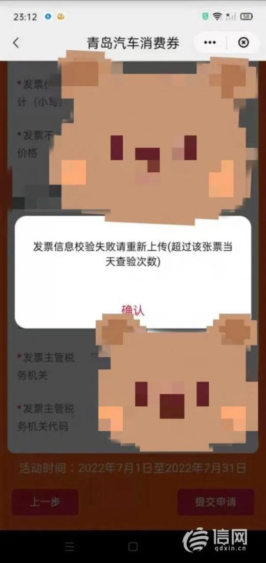曹女士正是在此期间购买了一辆汽车,因此能够参与此次活动。8月6日一早,她就做好准备,上午10点,中国银联云闪付APP开放资料上传通道,她第一时间上传发票等相关资料。但此后的遭遇却让人始料未及。“一直提示出错,要么是保存信息出错,要么是当前人数过多,好不容易到了最后一步,点击提交申请就完成了,但怎么也传不上,提示发票信息校验失败。”