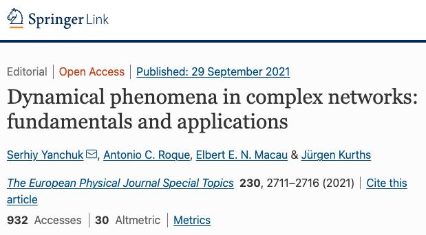 从流行病扩散到社交网络上的舆论传播,从大脑中意识的产生到地球气候系统中多种因素的互动,复杂网络是建模这些复杂系统的有力工具。2021年9月,The European Physical Journal 发表“复杂网络中的动力学现象”特刊,汇总了33篇关于复杂网络及其应用的论文。特刊分为三个部分,第一部分理论与方法介绍了网络社团检测、时间序列模式识别、同步、网络上的扩散传播现象等;其他两部分关注复杂网络在神经科学、地球科学中的应用,气候网络相关研究对于应对充满挑战性的地球气候问题具有重要意义。