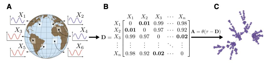 最后,我们介绍了复杂网络在地球科学的应用。我们将重点放在功能性气候网络[21,26,28]上,同时也展示了复杂气候网络如何成为解释多种过程和现象的工具,例如与Madden-Julian振荡(MJO)相关的赤道波相互作用[23]、海面温度与降水之间的全球主要协变模式[24]、热带雨林中火灾产生的时间与区域[25]、亚马逊的大降雨[27]、南美低层环流[29]、泛热带森林气候引起的迟滞现象[32]等等。