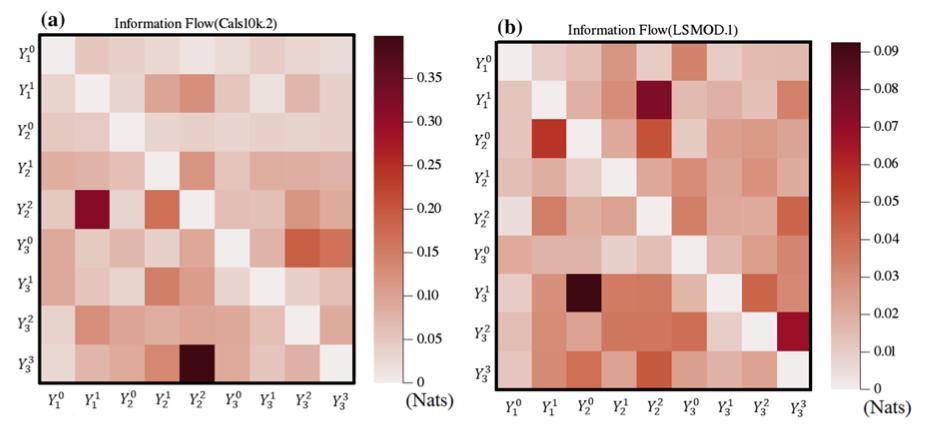 两种不同模型下地磁场球谐分量之间的信息流。该图表示从x轴部分发送给y轴部分的信息流