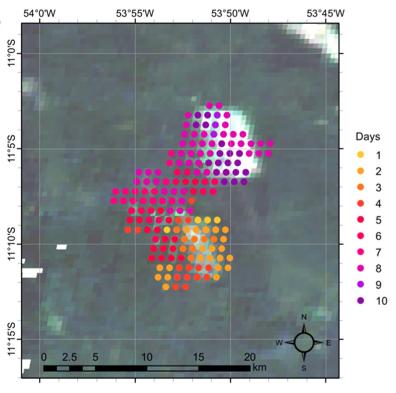 2004 年巴西马托格罗索州东北部发生的一场极端火灾在空间和时间上的演进。该火灾从 2004年9 月4日开始,持续燃烧了10天。
