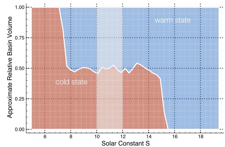 不同太阳常数S下,双稳态气候玩具模型的冷热态分布