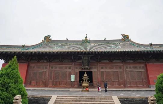 在两座明代建筑的后面便是崇福寺的主殿,建于金代皇统三年的弥陀殿。殿身面阔七间,进深四间,殿顶为九脊歇山式。