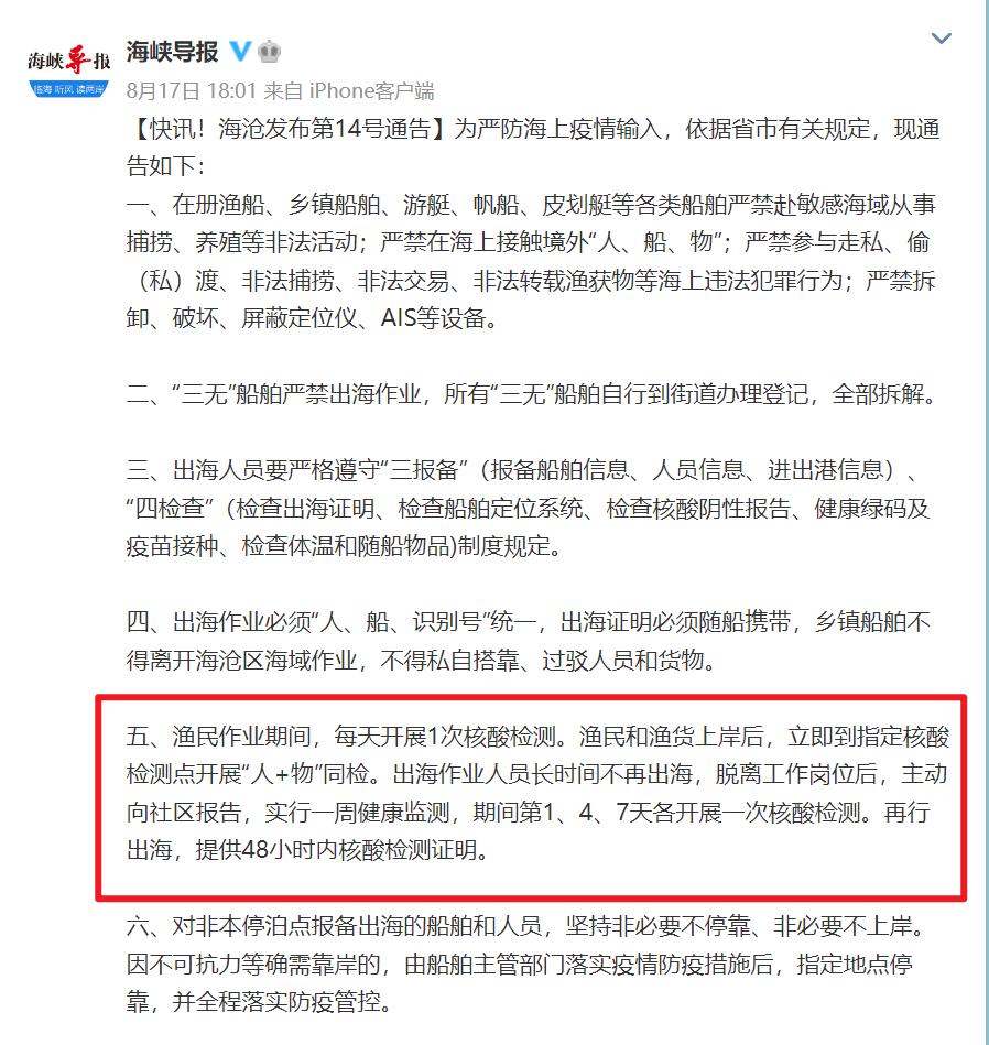 记者从微信公众号“平安集美”了解到,早在7月22日,集美区海上疫情防控组在《致集美区涉海村(社区)居民及出海作业人员的一封信》就要求“人+物”同检: