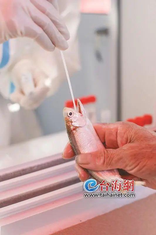 除了从鱼嘴提取采集物,核酸采集人员还细致地用棉签从渔获身上提取样本。