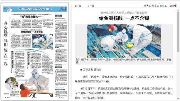 海南日报8月14日报道指出,儋州市实行临时性全域静态管理后,白马井中心渔港第一时间进入全封闭管理模式,并组织医护人员到船上开展多轮渔民核酸检测采样。医护人员还会对鱼和船内环境采样检测,并对船只进行消毒。