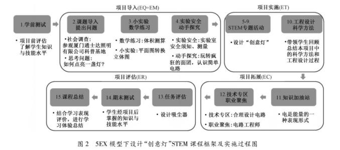依据设计“创意灯”课程的目标,课程内容按5EX模型构建的课程框架(见图2) ,即为:项目导入(EQ+EM) 、项目实施(ET) 、项目拓展(EC)和项目评价(ER)四阶段。