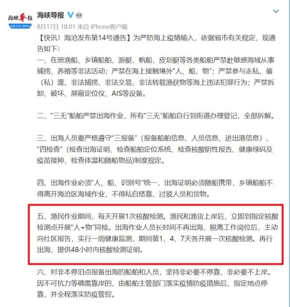 据厦门市海沧区应对新冠肺炎疫情工作指挥部发布的通知:渔民作业期间,每天开展1次核酸检测。渔民和渔货上岸后,立即到指定核酸检测点开展“人+物”同检。