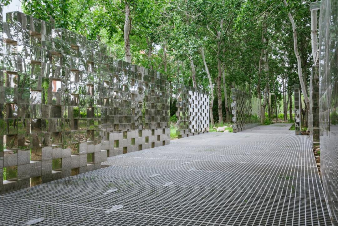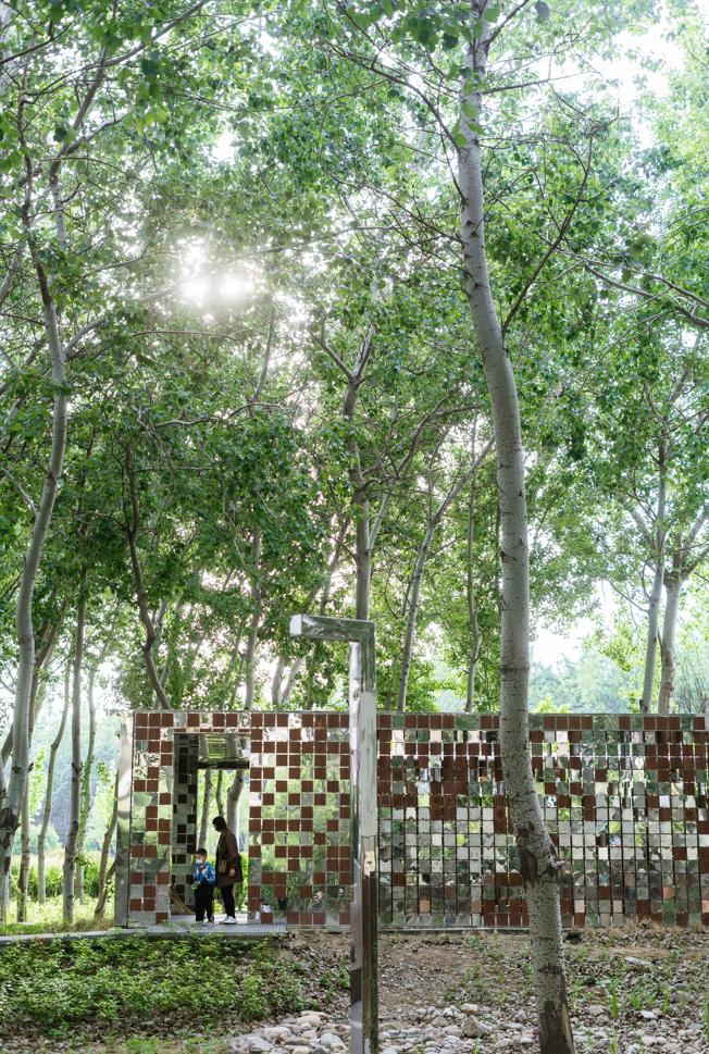 景观场景的视觉特征,是吸引游览者的重要因素,也是进入场地后最重要的直观感受。设计团队受到现状杨树林的启发,一方面通过低干扰设计,与环境充分共生,最大限度保护了场地生态。架空的格栅状栈道,保证了透水性的同时,允许地被植物的生长嵌入格栅的空隙,使人工构筑物与自然景观之间,产生了有趣的共生关系。
