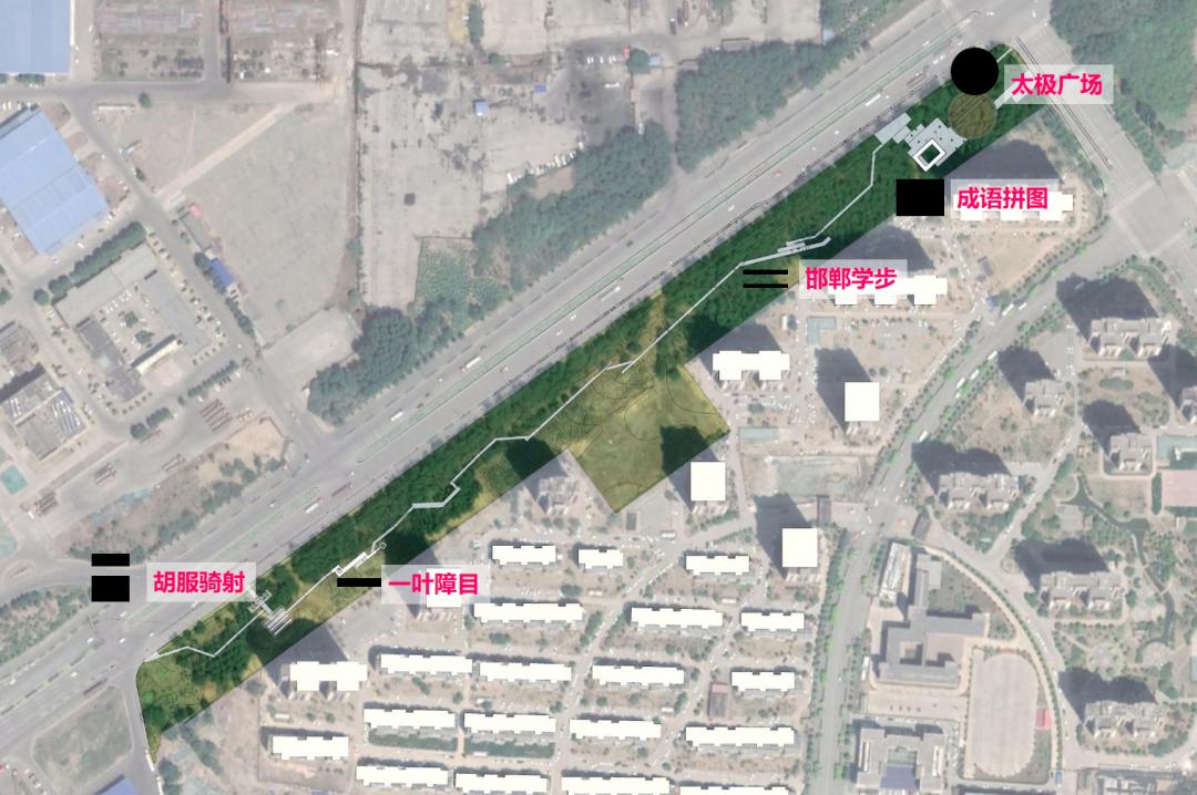 设计团队根据成语和太极文化主题,设置了胡服骑射,一叶障目、邯郸学步、成语拼图、太极广场5个景观节点。