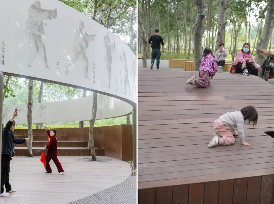 太极广场节点,通过悬浮式的穿孔板圆环构造,使太极拳招式图案漂浮在杨树林当中,为木质的广场营造氛围飘逸、功能多样的景观场景,为周边居民提供多功能的休闲与活动空间。