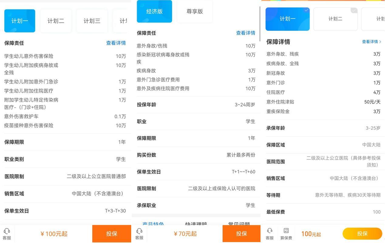 一般来说,3至24岁均可投保学平险,保费从几十元到一两百元,便可保意外、保疾病和伤残身故,其健康告知也很宽松。