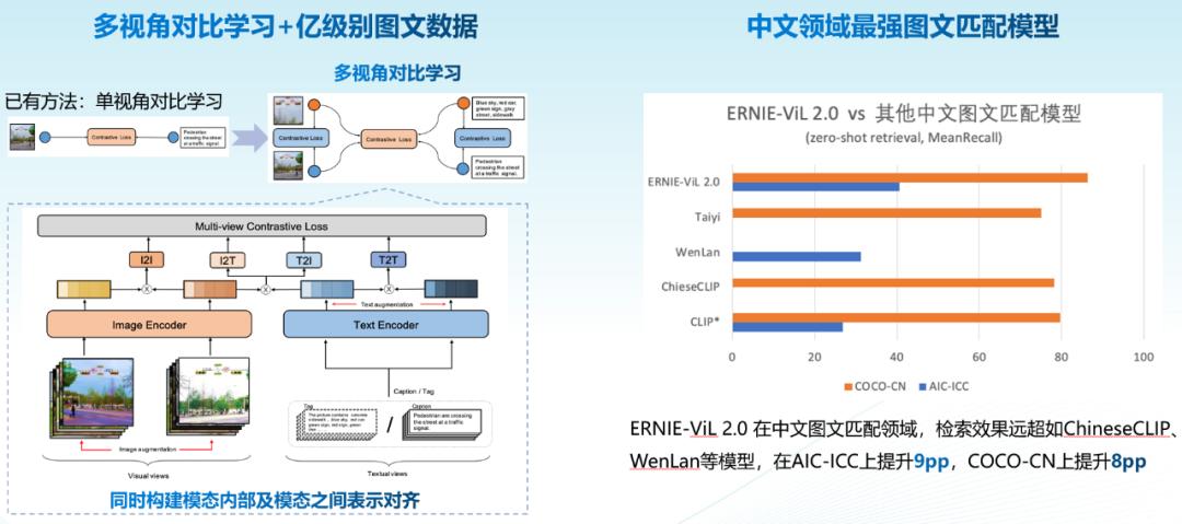 一方面对文心知识增强跨模态理解大模型的创新,提出了基于多视角对比学习的 ERNIE-ViL 2.0,在预训练过程同时学习模态间和模态内的多种关联性,提升了「图像」和「文本」跨模态语义匹配效果,检索效果远超 ChineseCLIP、WenLan 等模型。